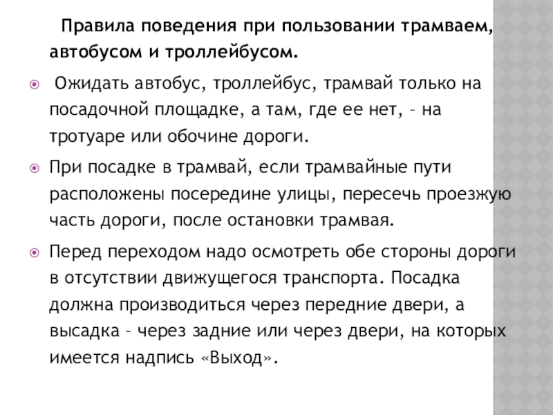 Слайд 6 Правила поведения при пользовании трамваем, автобусом и троллейбусом.