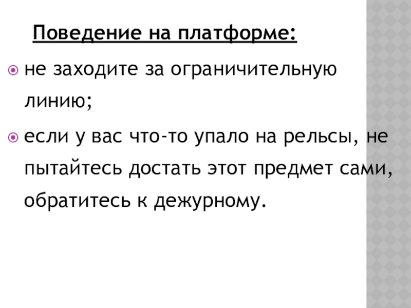 упало на рельсы, не пытайтесь достать этот предмет сами, обратитесь к дежурному.