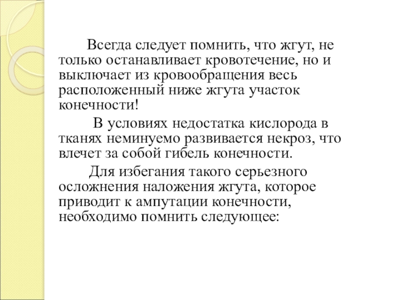 Всегда следует помнить, что жгут, не только останавливает кровотечение, но и выключает из кровообращения весь расположенный ниже жгута участок конечности!