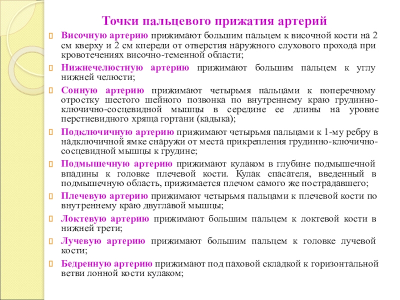 Существуют стандартные точки в проекции крупных артерий, в которых удобно осуществить прижатие сосуда к подлежащим костным выступам. Эти точки важно не просто знать, но и уметь быстро и эффективно прижимать в указанных местах артерию, не тратя время на ее поиски.