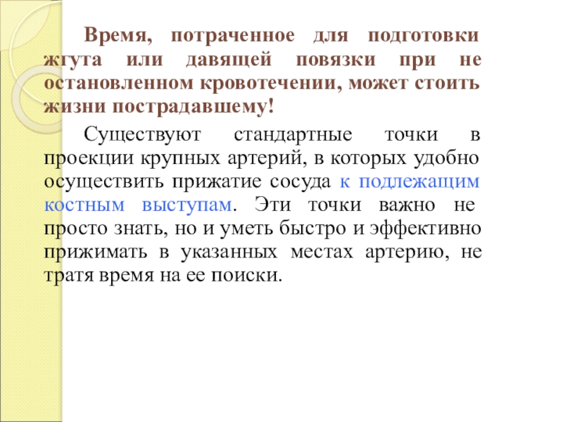 Слайд 9 Время, потраченное для подготовки жгута или давящей повязки при не остановленном