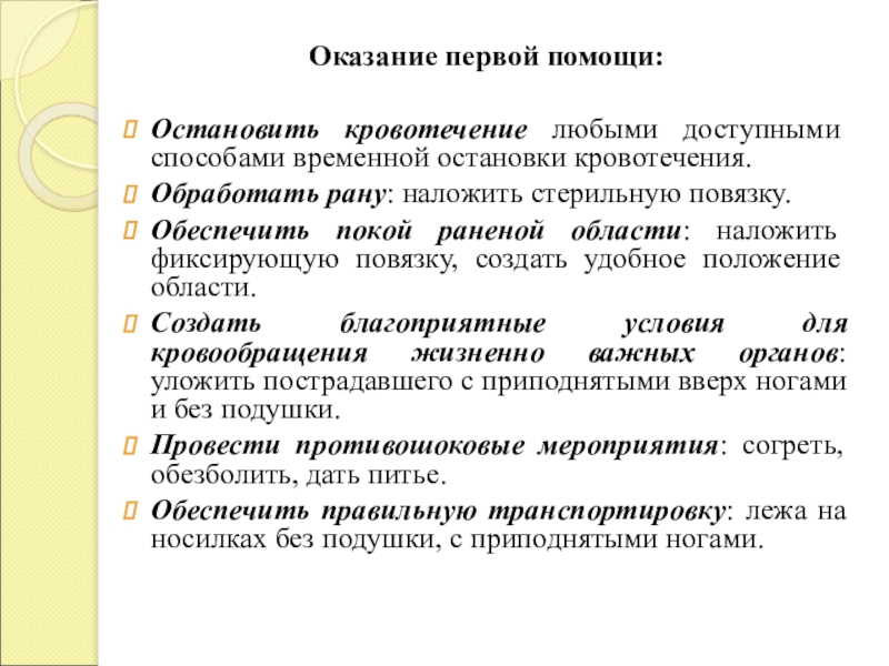 Провести противошоковые мероприятия: согреть, обезболить, дать питье.