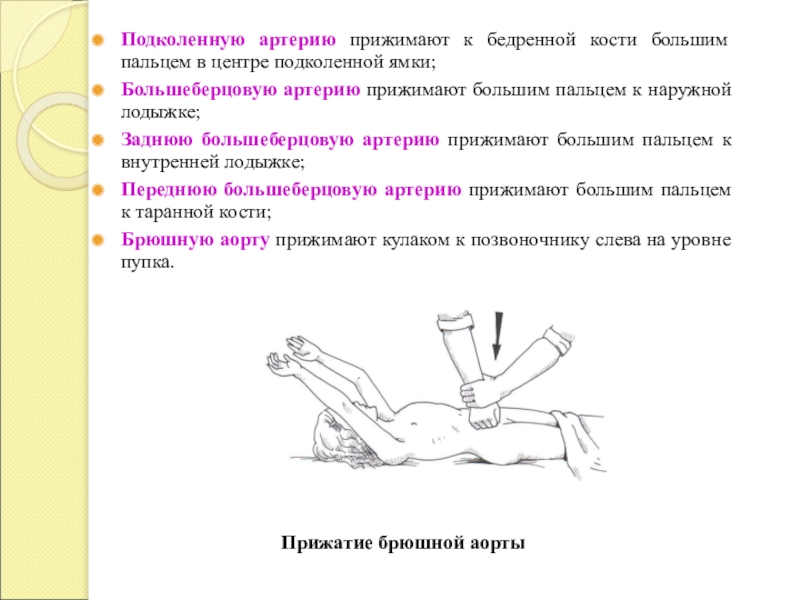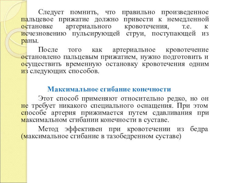 Слайд 13 Следует помнить, что правильно произведенное пальцевое прижатие должно привести к немедленной