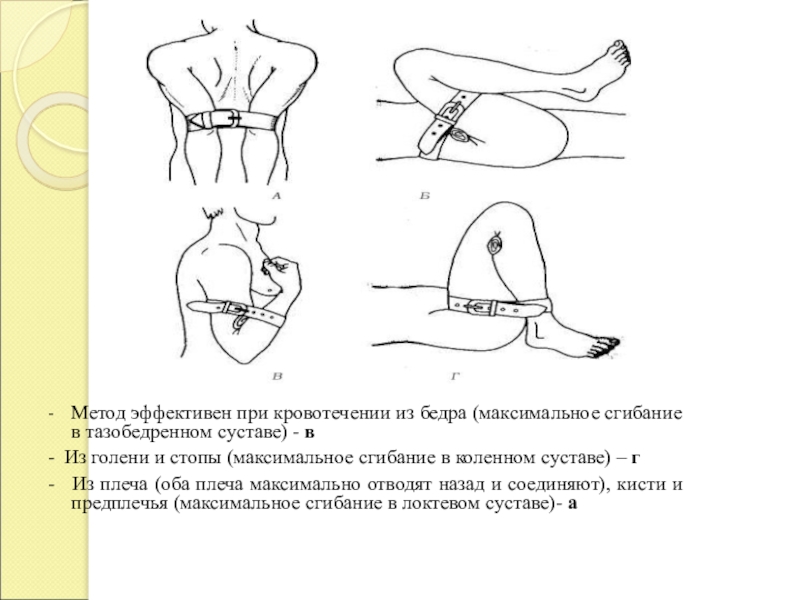 Слайд 14- Метод эффективен при кровотечении из бедра (максимальное сгибание в