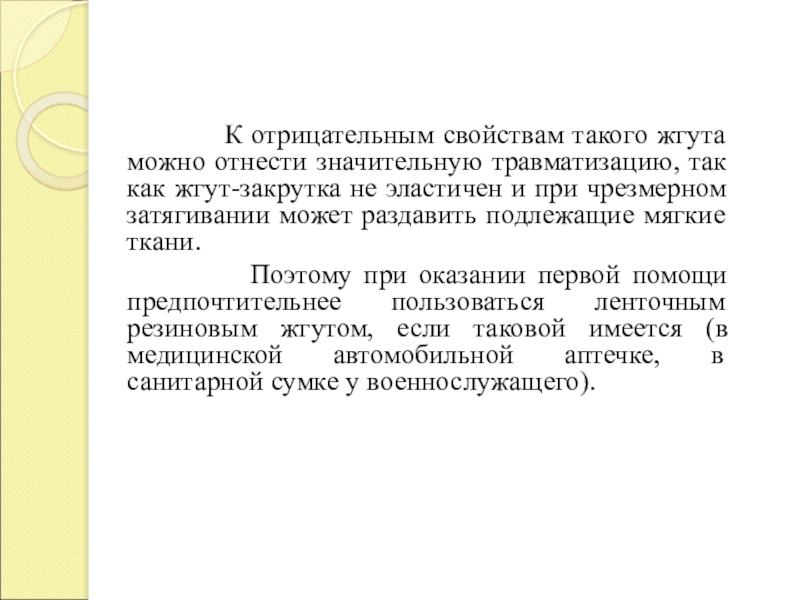 свойствам такого жгута можно отнести значительную травматизацию, так как жгут-закрутка не эластичен и при чрезмерном затягивании может раздавить подлежащие мягкие ткани.