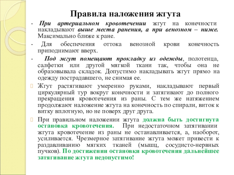 При правильном наложении жгута должна быть достигнута остановка кровотечения. При недостаточном затягивании жгута кровотечение из раны не останавливается, а, наоборот, усиливается. Чрезмерное затягивание жгута может привести к раздавливанию мягких тканей (мышц, сосудисто-нервных пучков). По достижении остановки кровотечения дальнейшее затягивание жгута недопустимо!