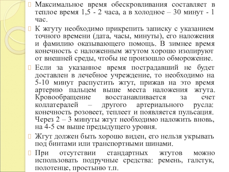К жгуту необходимо прикрепить записку с указанием точного времени (дата, часы, минуты), его наложения и фамилию оказывающего помощь. В зимнее время конечность с наложенным жгутом хорошо изолируют от внешней среды, чтобы не произошло обморожение.