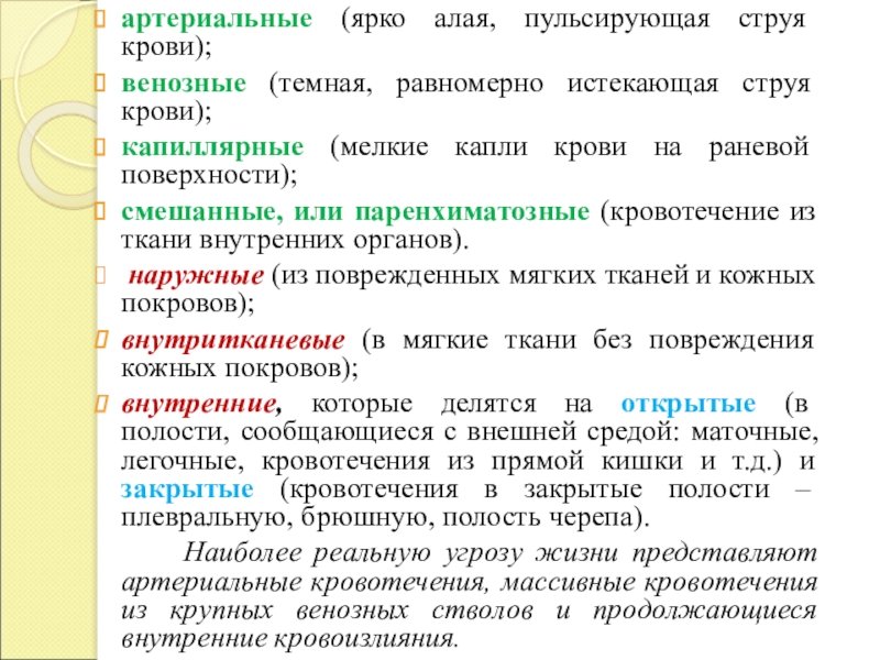 Наиболее реальную угрозу жизни представляют артериальные кровотечения, массивные кровотечения из крупных венозных стволов и продолжающиеся внутренние кровоизлияния.