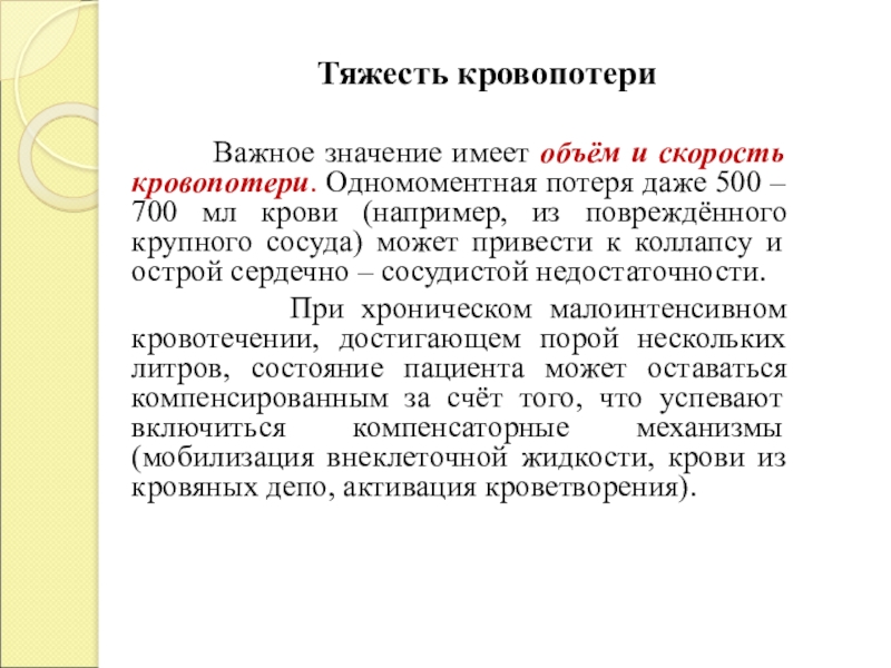и скорость кровопотери. Одномоментная потеря даже 500 – 700 мл крови (например, из повреждённого крупного сосуда) может привести к коллапсу и острой сердечно – сосудистой недостаточности.