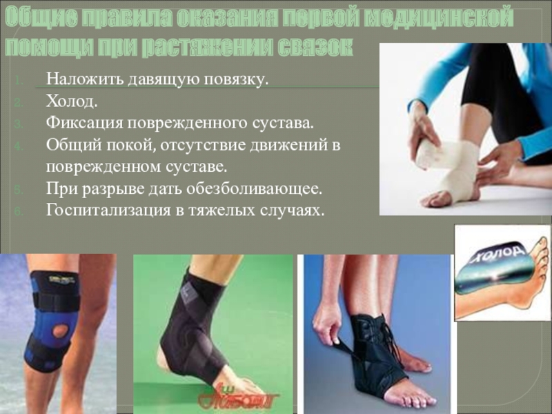 Слайд 5Общие правила оказания первой медицинской помощи при растяжении связок