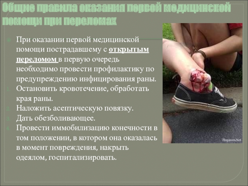 Слайд 16Общие правила оказания первой медицинской помощи при переломах
