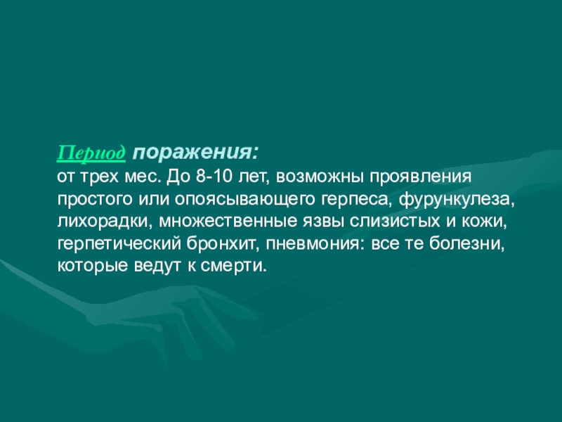 опоясывающего герпеса, фурункулеза, лихорадки, множественные язвы слизистых и кожи, герпетический бронхит, пневмония: все те болезни, которые ведут к смерти.