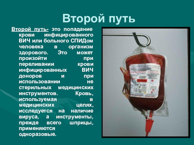 Второй путь- это попадание крови инфицированного ВИЧ или больного СПИДом
