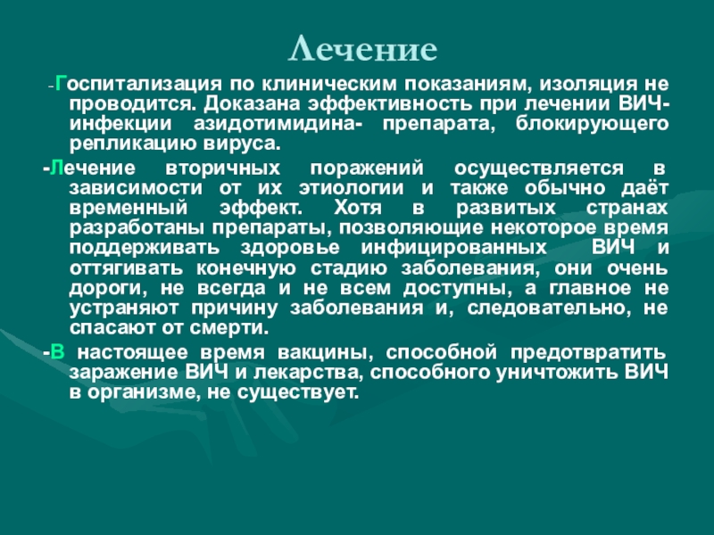 -Лечение вторичных поражений осуществляется в зависимости от их этиологии и также обычно даёт временный эффект. Хотя в развитых странах разработаны препараты, позволяющие некоторое время поддерживать здоровье инфицированных ВИЧ и оттягивать конечную стадию заболевания, они очень дороги, не всегда и не всем доступны, а главное не устраняют причину заболевания и, следовательно, не спасают от смерти.