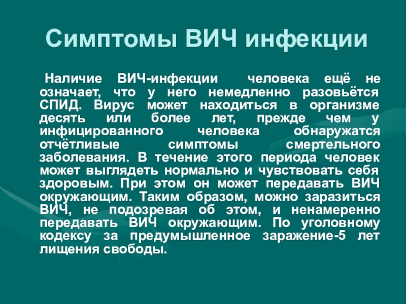немедленно разовьётся СПИД. Вирус может находиться в организме десять или более лет, прежде чем у инфицированного человека обнаружатся отчётливые симптомы смертельного заболевания. В течение этого периода человек может выглядеть нормально и чувствовать себя здоровым. При этом он может передавать ВИЧ окружающим. Таким образом, можно заразиться ВИЧ, не подозревая об этом, и ненамеренно передавать ВИЧ окружающим. По уголовному кодексу за предумышленное заражение-5 лет лищения свободы.