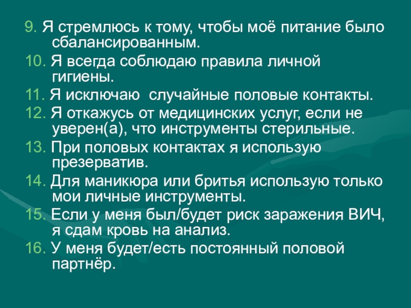 15. Если у меня был/будет риск заражения ВИЧ, я сдам кровь на анализ.