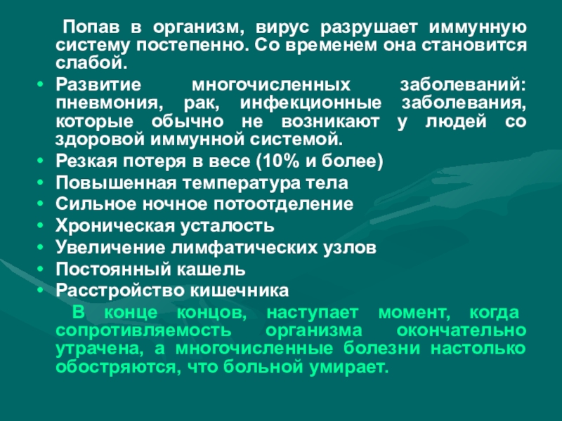 Слайд 11 Попав в организм, вирус разрушает иммунную систему постепенно. Со временем она