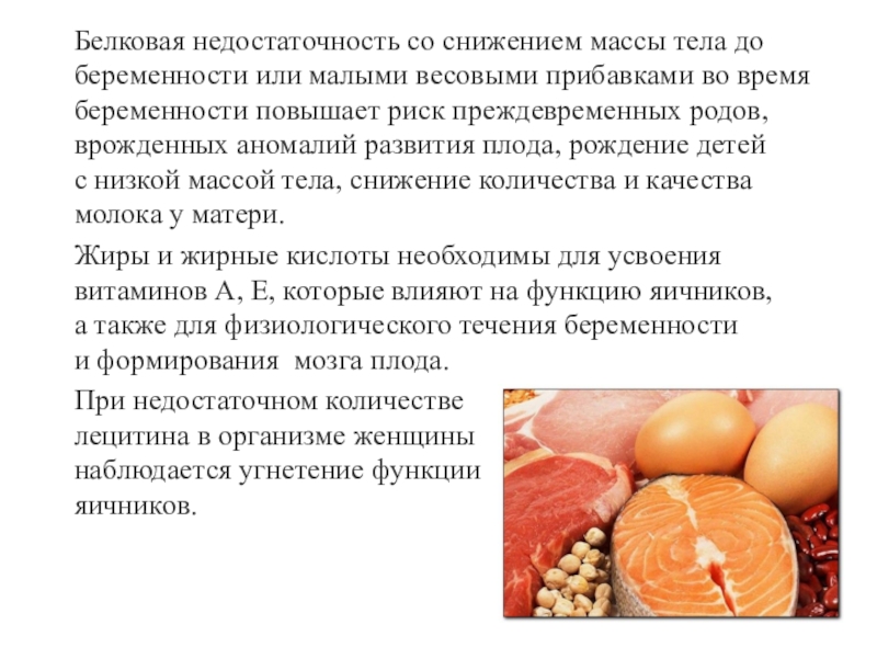 Слайд 10Белковая недостаточность со снижением массы тела до беременности или малыми весовыми