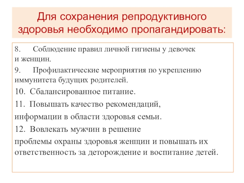 проблемы охраны здоровья женщин и повышать их ответственность за деторождение и воспитание детей.