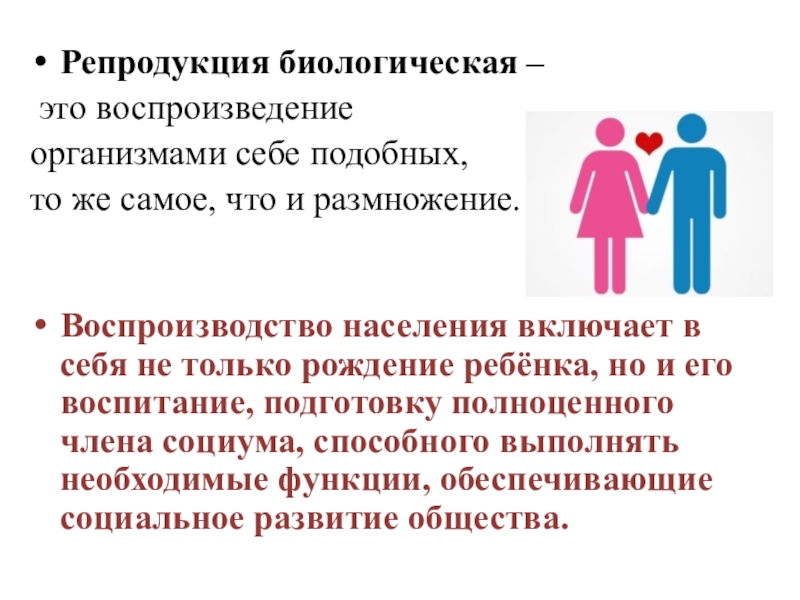 Воспроизводство населения включает в себя не только рождение ребёнка, но и его воспитание, подготовку полноценного члена социума, способного выполнять необходимые функции, обеспечивающие социальное развитие общества.