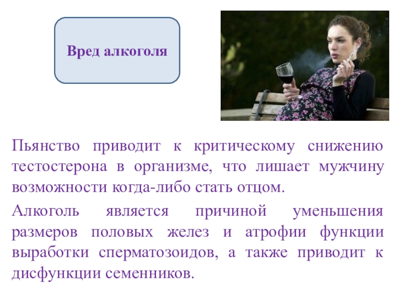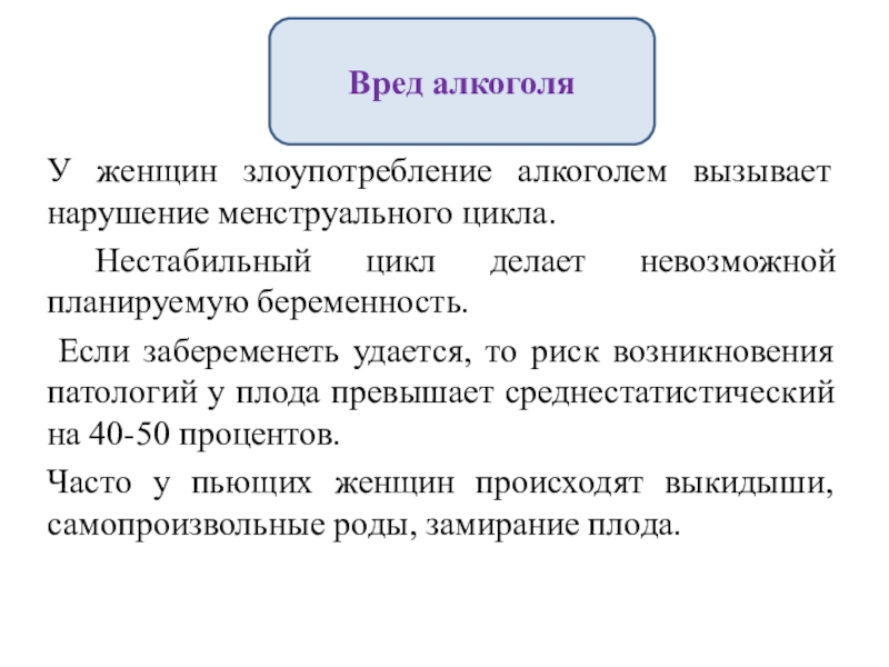 Слайд 17У женщин злоупотребление алкоголем вызывает нарушение менструального цикла.