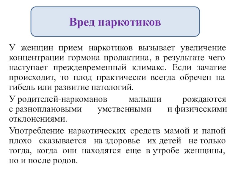 Слайд 19У женщин прием наркотиков вызывает увеличение концентрации гормона пролактина, в результате