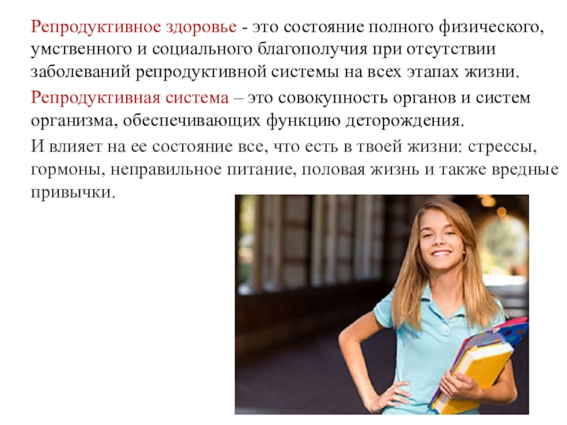 Слайд 2Репродуктивное здоровье - это состояние полного физического, умственного и социального благополучия