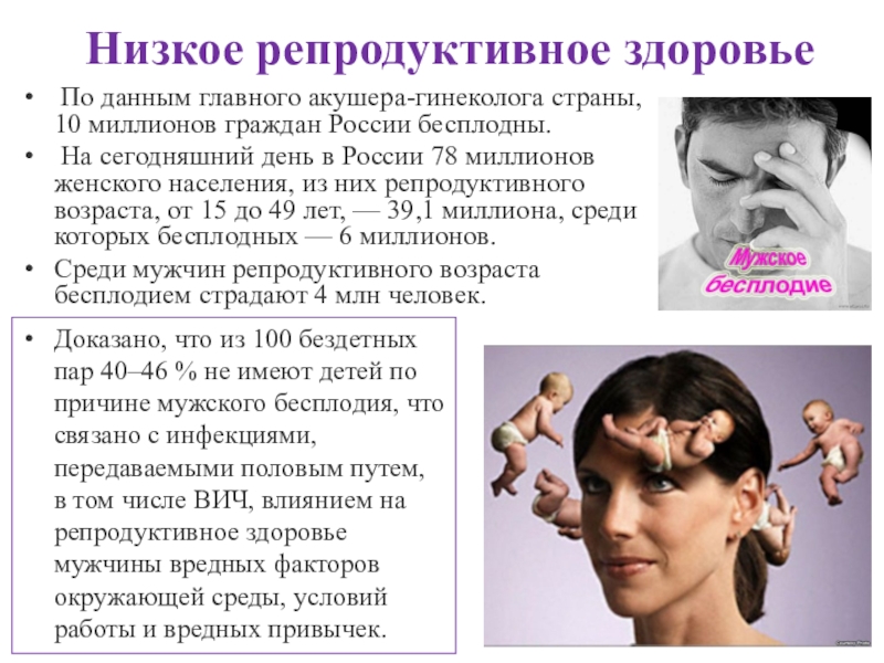 Доказано, что из 100 бездетных пар 40–46 % не имеют детей по причине мужского бесплодия, что связано с инфекциями, передаваемыми половым путем, в том числе ВИЧ, влиянием на репродуктивное здоровье мужчины вредных факторов окружающей среды, условий работы и вредных привычек.
