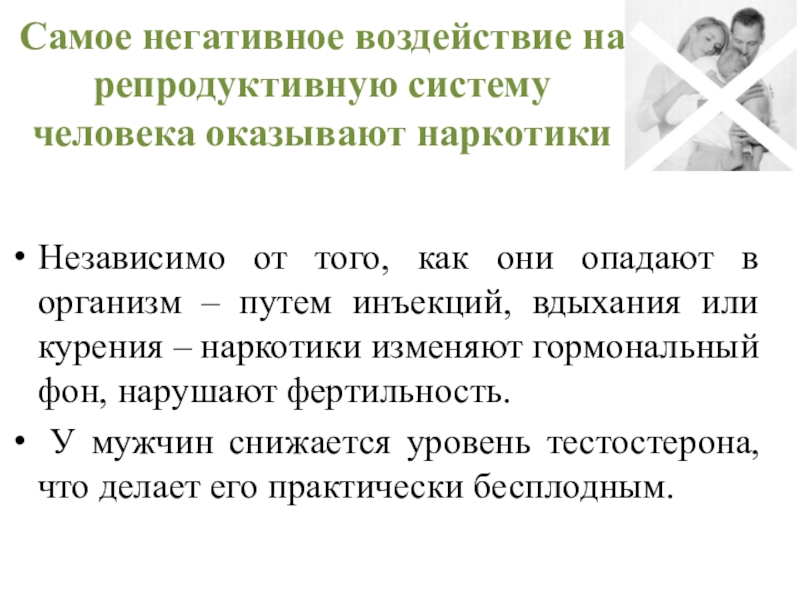 как они опадают в организм – путем инъекций, вдыхания или курения – наркотики изменяют гормональный фон, нарушают фертильность.