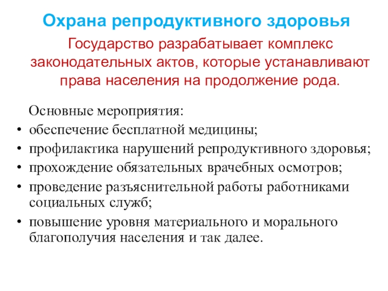 Государство разрабатывает комплекс законодательных актов, которые устанавливают права населения на продолжение рода.