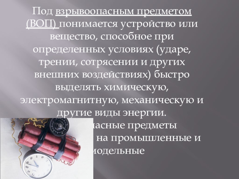 Слайд 11Под взрывоопасным предметом (ВОП) понимается устройство или вещество, способное при определенных