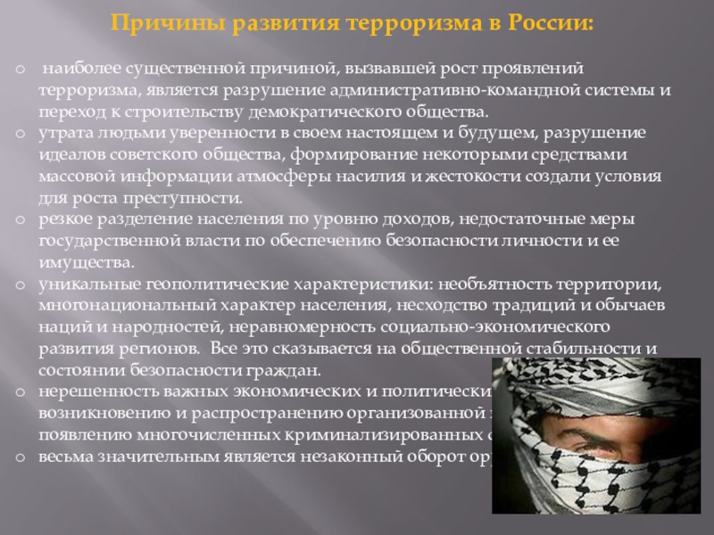 терроризма, является разрушение административно-командной системы и переход к строительству демократического общества.