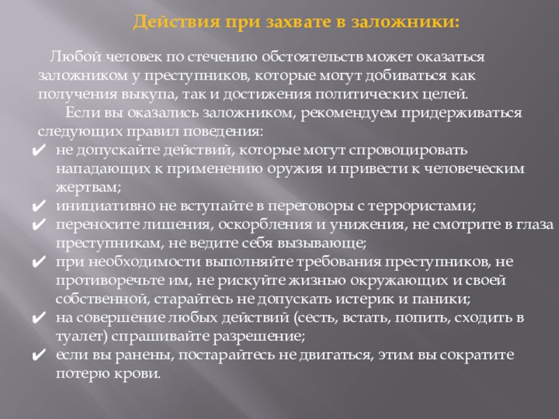 Если вы оказались заложником, рекомендуем придерживаться следующих правил поведения: