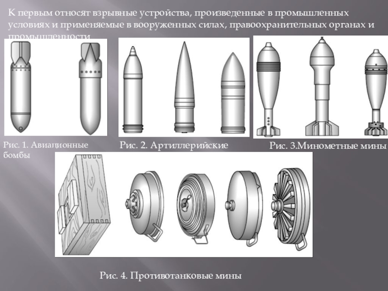 Слайд 12К первым относят взрывные устройства, произведенные в промышленных условиях и применяемые