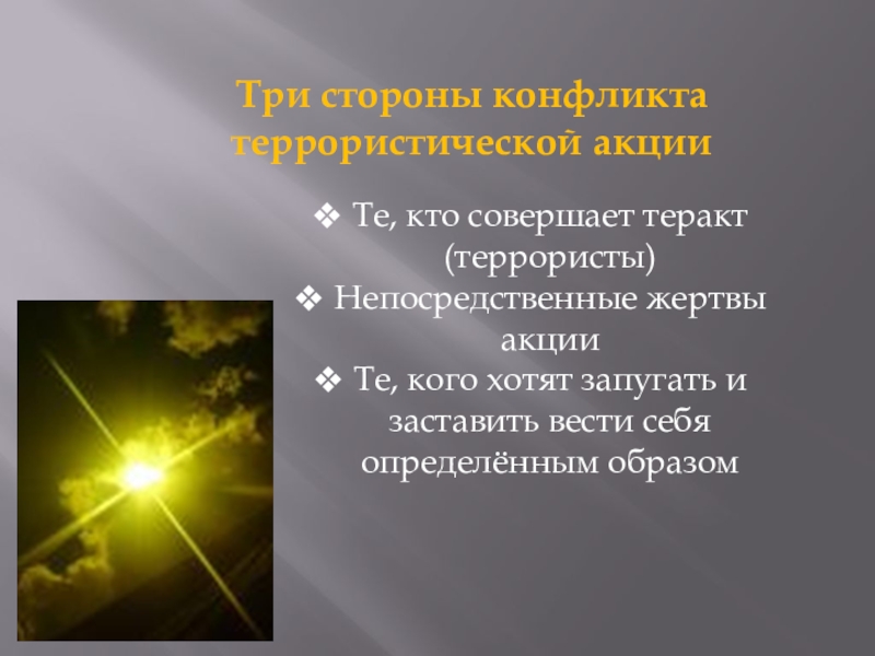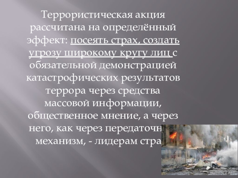 Слайд 4Террористическая акция рассчитана на определённый эффект: посеять страх, создать угрозу широкому