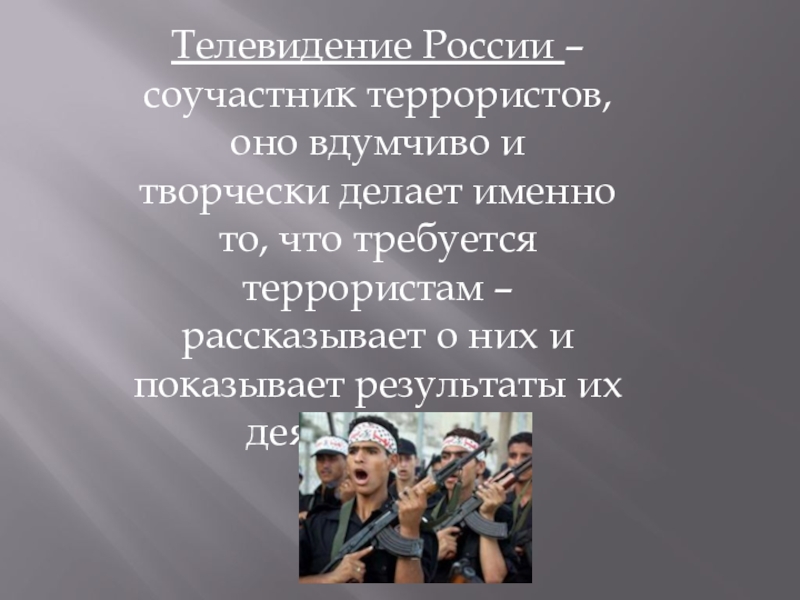 Слайд 6Телевидение России – соучастник террористов, оно вдумчиво и творчески делает именно