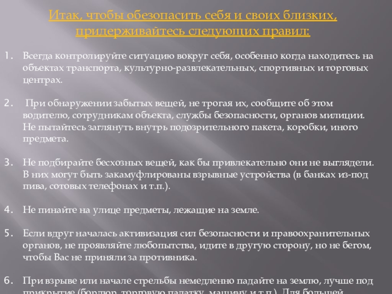 ситуацию вокруг себя, особенно когда находитесь на объектах транспорта, культурно-развлекательных, спортивных и торговых центрах.