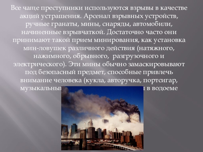 Слайд 10Все чаще преступники используются взрывы в качестве акций устрашения. Арсенал взрывных