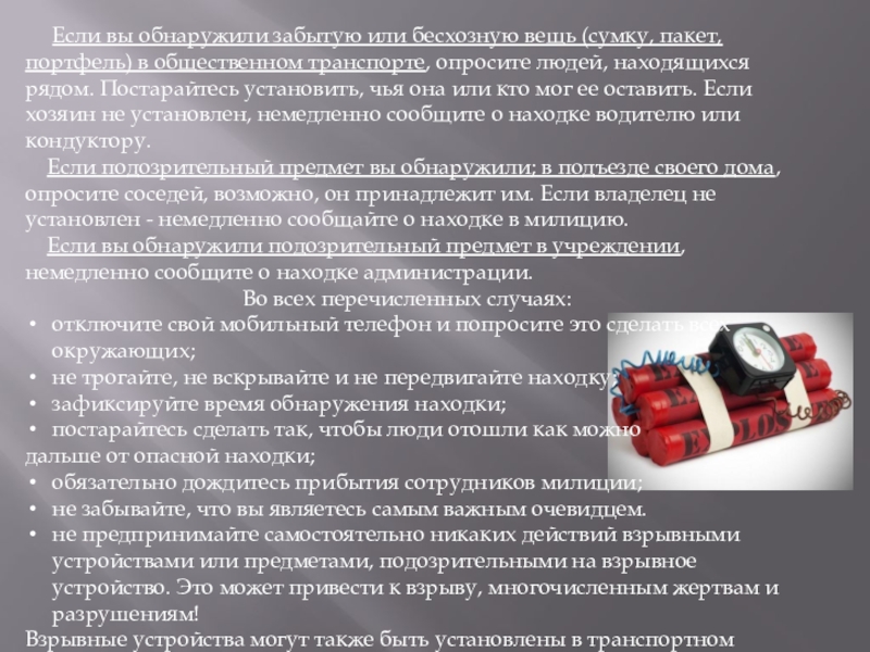пакет, портфель) в общественном транспорте, опросите людей, находящихся рядом. Постарайтесь установить, чья она или кто мог ее оставить. Если хозяин не установлен, немедленно сообщите о находке водителю или кондуктору.