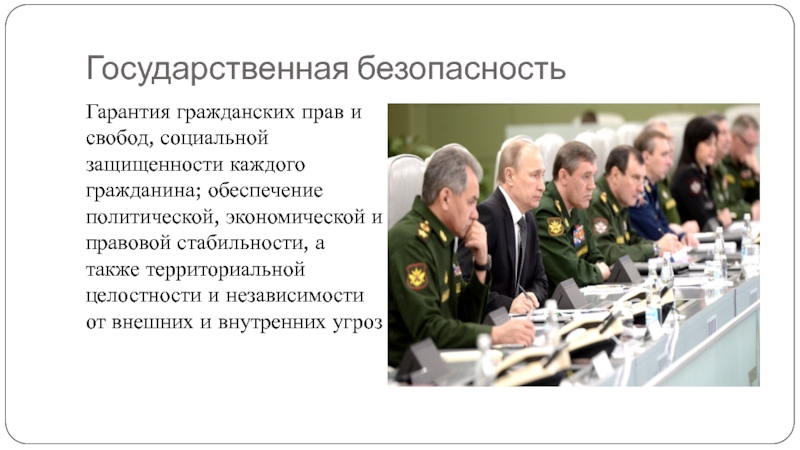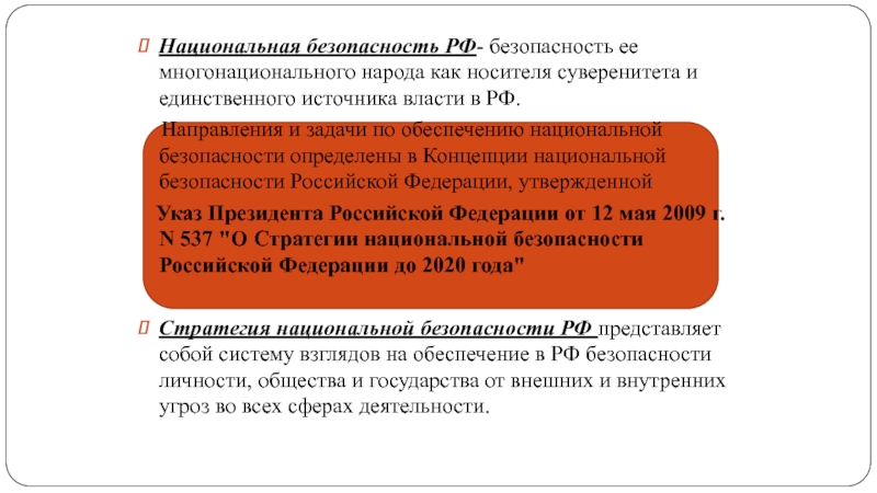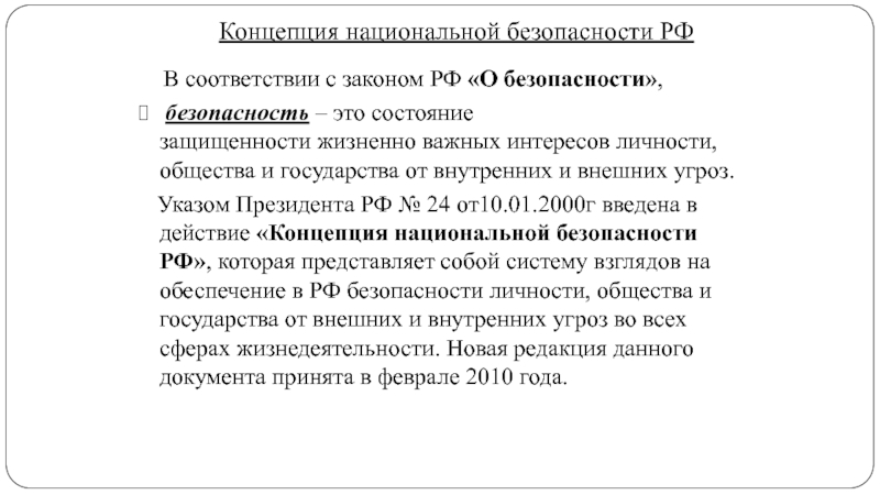 Указом Президента РФ № 24 от10.01.2000г введена в действие «Концепция национальной безопасности РФ», которая представляет собой систему взглядов на обеспечение в РФ безопасности личности, общества и государства от внешних и внутренних угроз во всех сферах жизнедеятельности. Новая редакция данного документа принята в феврале 2010 года.