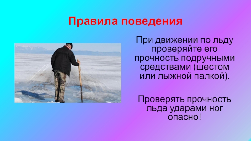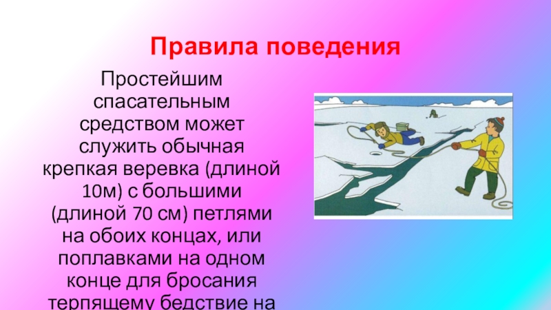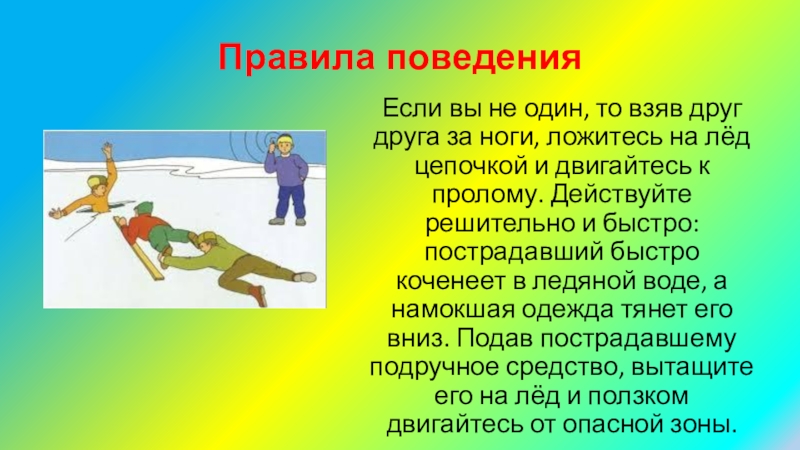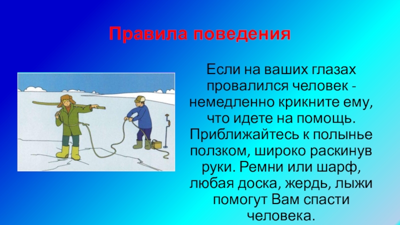 Если на ваших глазах провалился человек - немедленно крикните ему, что идете на помощь. Приближайтесь к полынье ползком, широко раскинув руки. Ремни или шарф, любая доска, жердь, лыжи помогут Вам спасти человека.