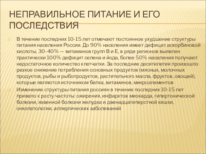длительная транспортировка и хранение продуктов питания, уменьшающая содержание в них биологически активных веществ, многие витамины и минералы начинают разрушаться с того момента, как фрукт или овощ сорван, и длительный период хранения практически сводит на нет питательную ценность продукта;
