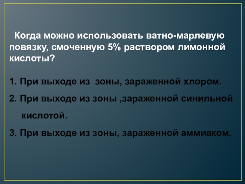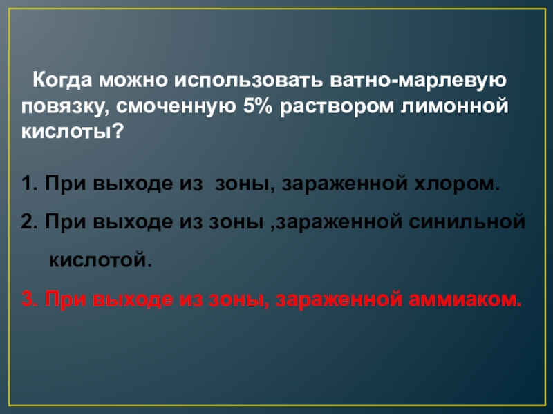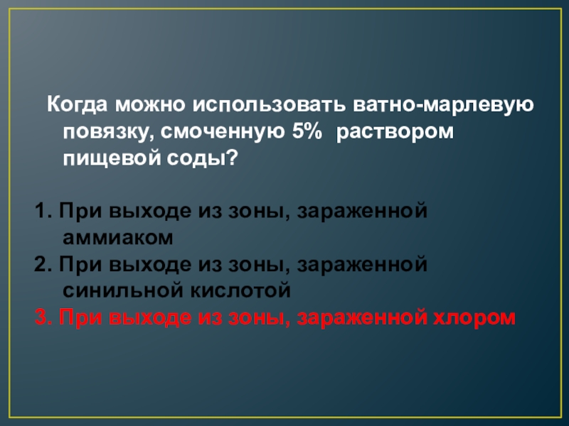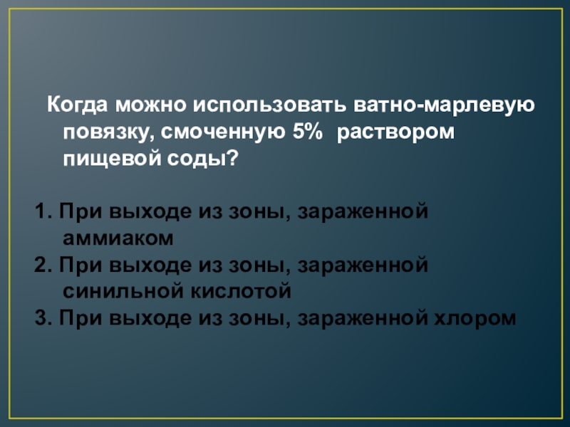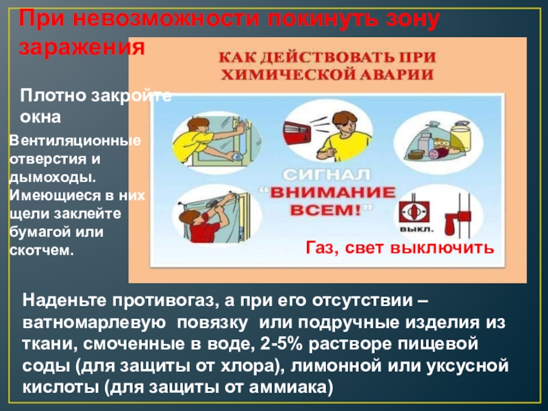 Наденьте противогаз, а при его отсутствии – ватномарлевую повязку или подручные изделия из ткани, смоченные в воде, 2-5% растворе пищевой соды (для защиты от хлора), лимонной или уксусной кислоты (для защиты от аммиака)