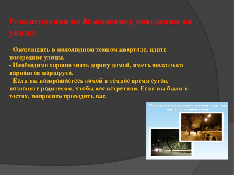 Рекомендации по безопасному поведению на улице:    - Оказавшись в малолюдном темном квартале, идите посередине