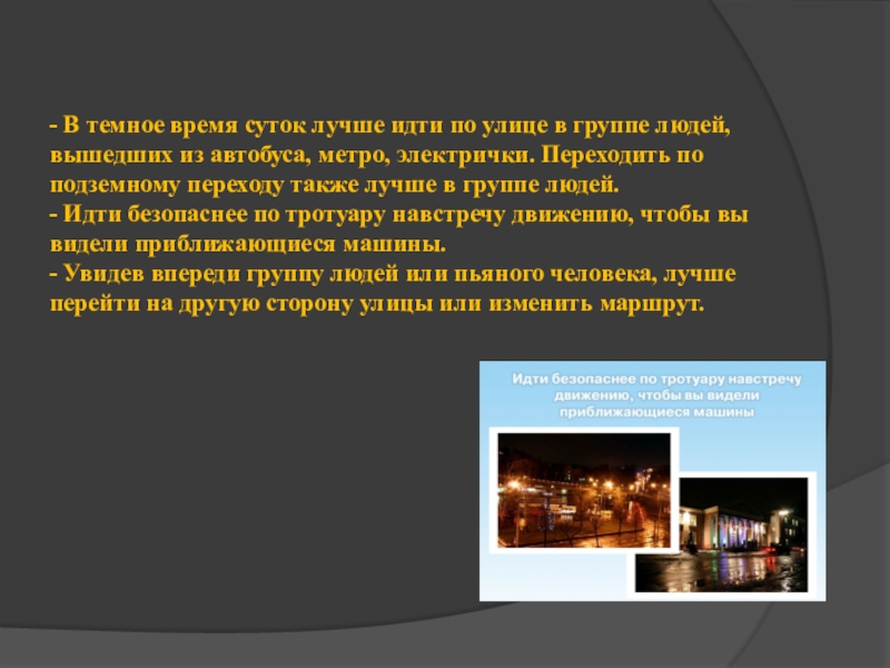 людей, вышедших из автобуса, метро, электрички. Переходить по подземному переходу также лучше в группе людей. - Идти безопаснее по тротуару навстречу движению, чтобы вы видели приближающиеся машины. - Увидев впереди группу людей или пьяного человека, лучше перейти на другую сторону улицы или изменить маршрут.