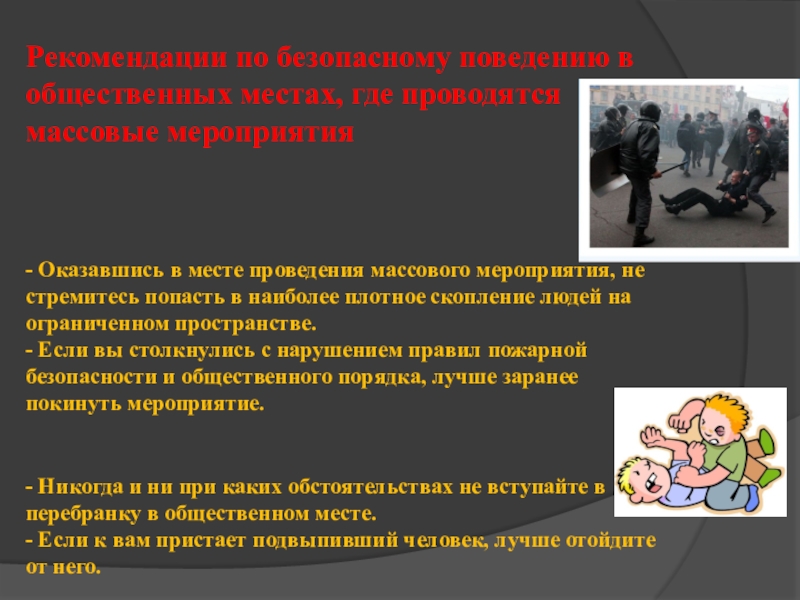 Слайд 8Рекомендации по безопасному поведению в общественных местах, где проводятся массовые мероприятия -