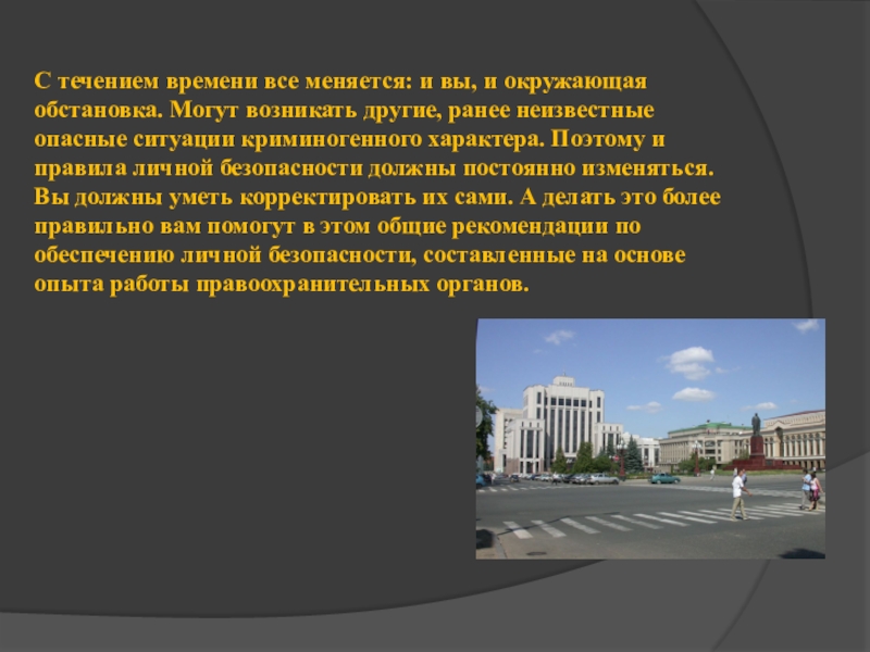 возникать другие, ранее неизвестные опасные ситуации криминогенного характера. Поэтому и правила личной безопасности должны постоянно изменяться. Вы должны уметь корректировать их сами. А делать это более правильно вам помогут в этом общие рекомендации по обеспечению личной безопасности, составленные на основе опыта работы правоохранительных органов.