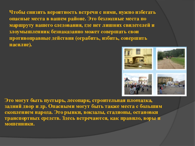 Это могут быть пустырь, лесопарк, строительная площадка, задний двор и др. Опасными могут быть также места с большим скоплением народа. Это рынки, вокзалы, стадионы, остановки транспортных средств. Здесь встречаются, как правило, воры и мошенники.