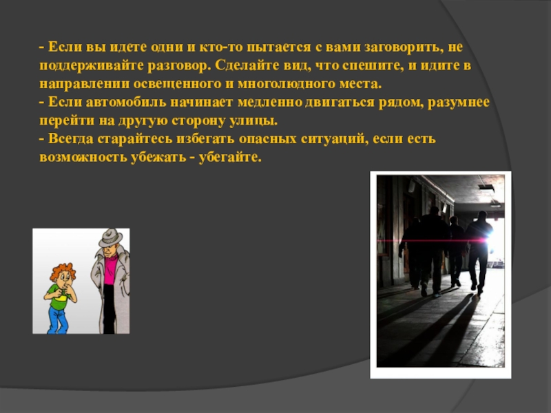 не поддерживайте разговор. Сделайте вид, что спешите, и идите в направлении освещенного и многолюдного места. - Если автомобиль начинает медленно двигаться рядом, разумнее перейти на другую сторону улицы. - Всегда старайтесь избегать опасных ситуаций, если есть возможность убежать - убегайте.