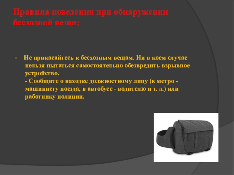 Правила поведения при обнаружении бесхозной вещи:  -  Не прикасайтесь к бесхозным вещам. Ни в коем
